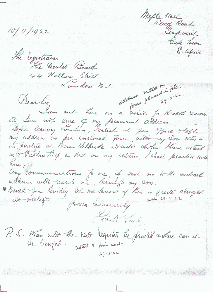 "The Dental Board" on his way to South Africa, by November 1922 he is