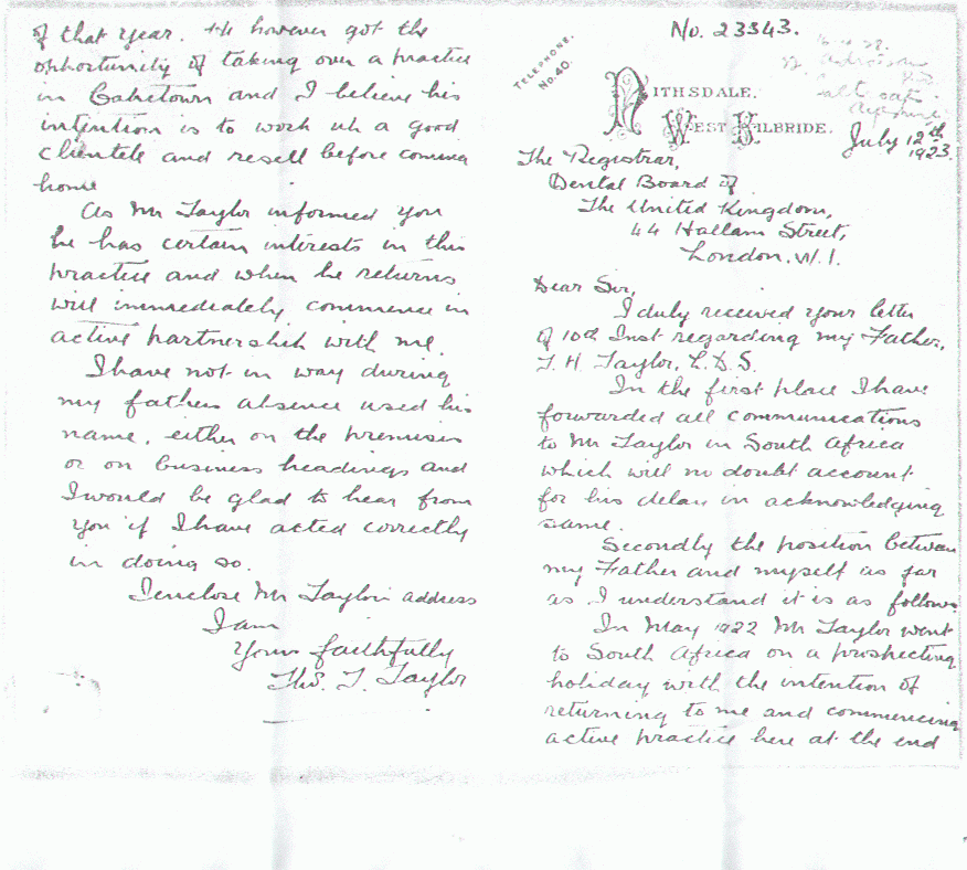 of letter from Thomas T Taylor to the Dentist Board dated 12th